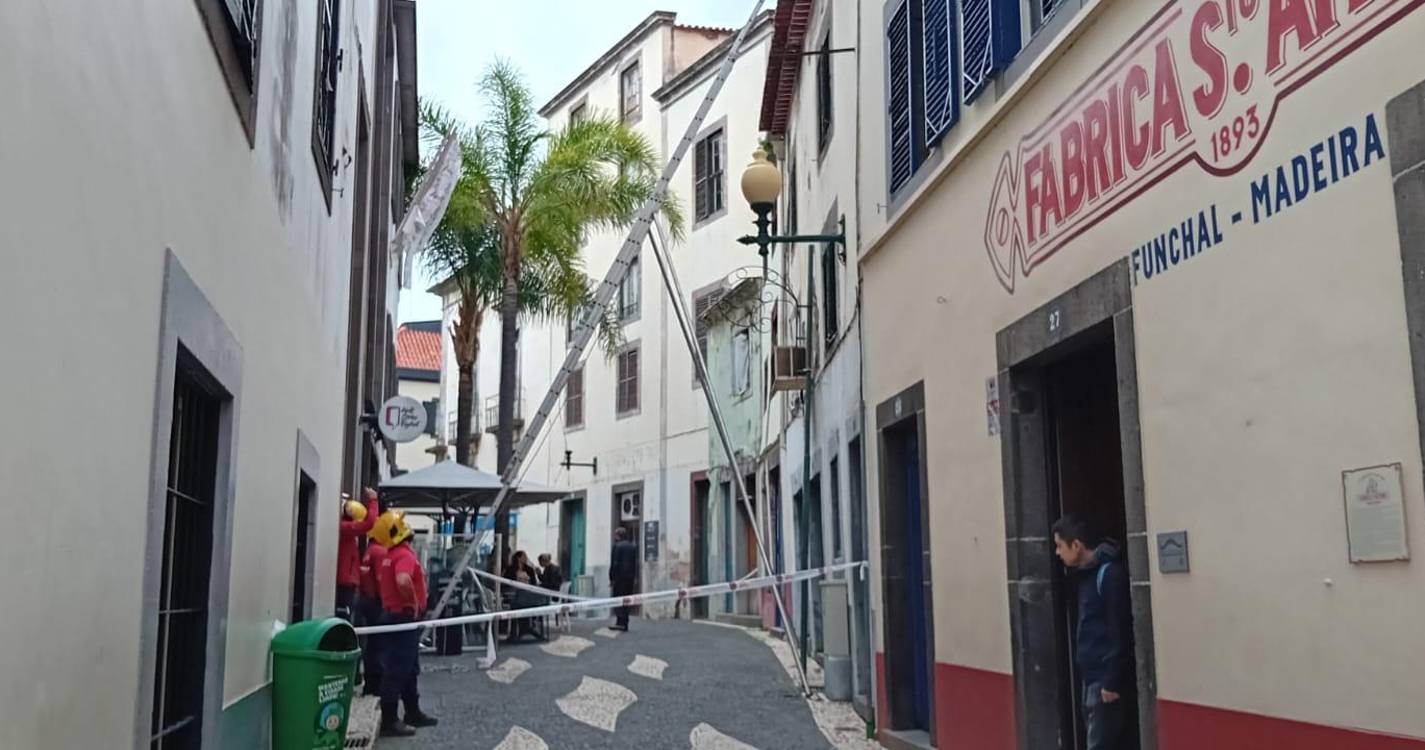 O Serviço Regional de Proteção Civil e os Bombeiros Voluntários Madeirenses (BVM) encontram-se na Travessa do Forno, no Funchal, a realizar uma vistoria a um prédio, na sequência da queda de materiais do telhado.
