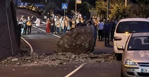 Uma carrinha de vários lugares ficou destruída, durante a noite de sábado, na sequência da queda de uma pedra de grandes dimensões no Curral das Freiras.