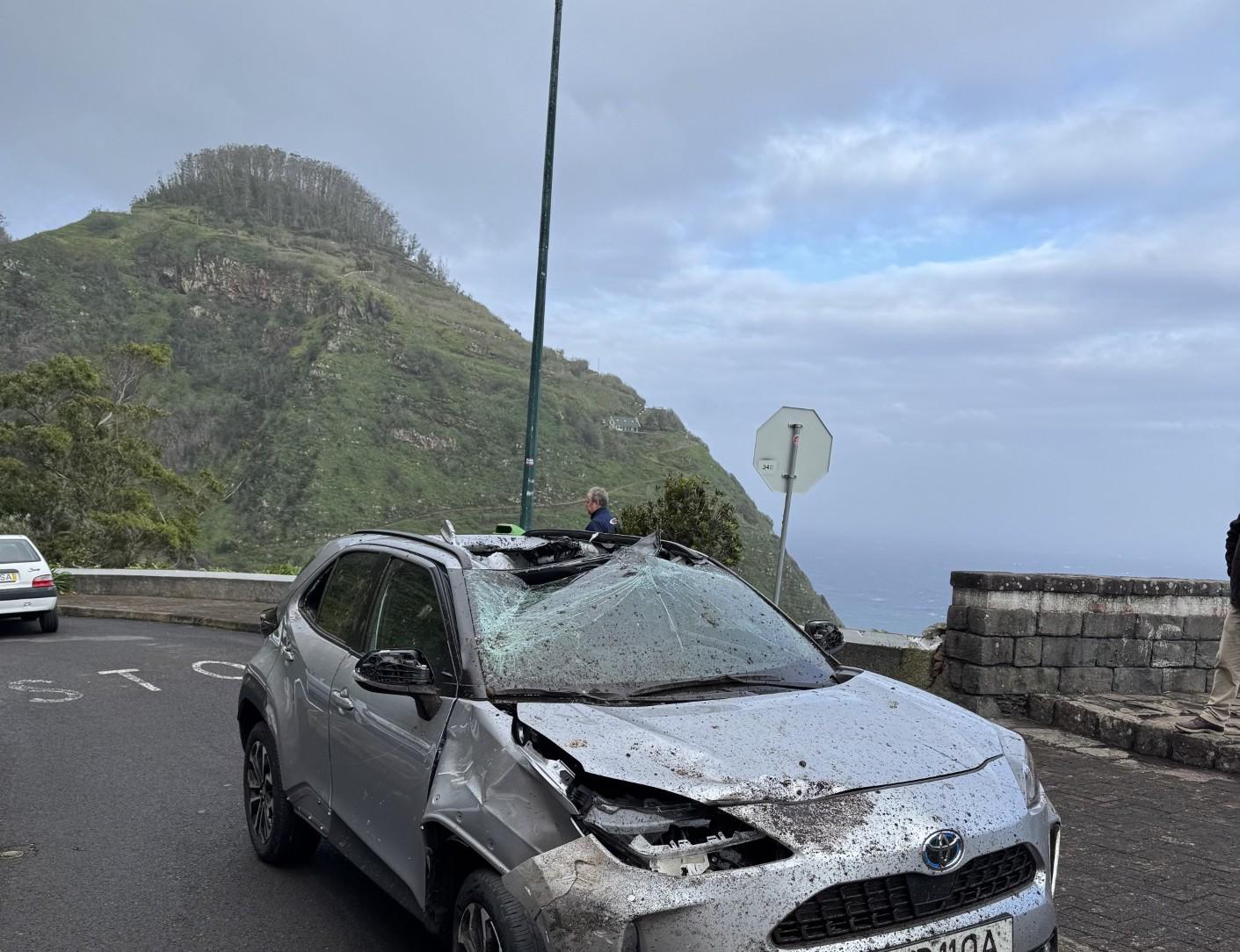 Uma rocha caiu esta manhã, por volta das 8h50, em cima de um carro estacionado nas proximidades do miradouro do Porto Moniz.