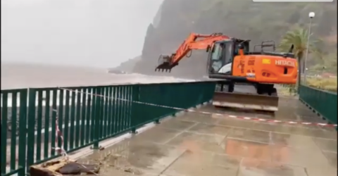 Duas máquinas retro-escavadoras da AFA estão a desassorear a foz de uma ribeira na Madalena do Mar que cujo caudal foi elevado e está ameaçar a estrutra de uma ponte.
