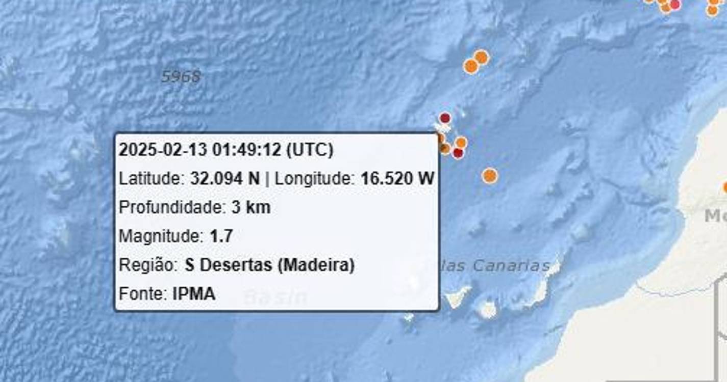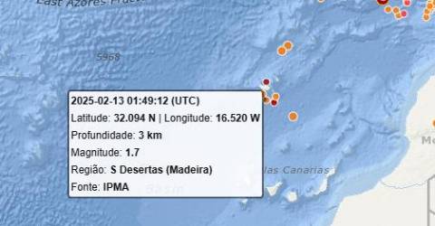 O Instituto Português do Mar e da Atmosfera (IPMA) registou, esta madrugada, pelas 01:49, um sismo de magnitude 1.7 a sul das Desertas.