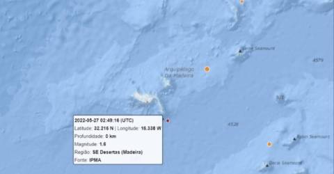 Foi registado, esta noite, um sismo de magnitude 1.6 na escala de Richter a Sudeste das Desertas.