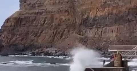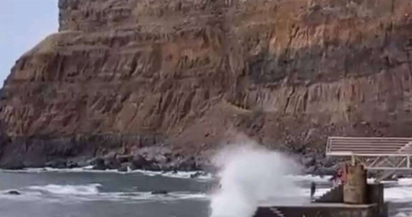 As imagens que aqui reproduzimos mostram um conjunto de pessoas a desafiar o mar no cais da Madalena do Mar, zona oeste da ilha.