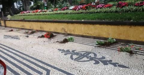 Como demonstra a imagem, foram arrancadas flores no Jardim Municipal e, depois, jogadas para o passeio.