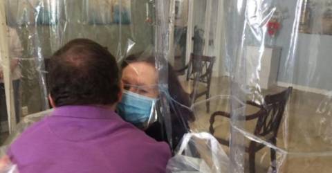 ‘Mãe querida, mãe querida! O melhor que a gente tem. Não há outro amor na vida igual ao amor de mãe!’, foi a cantar a música de Jorge Ferreira que Dolores Wagner, utente do Lar de Santa Isabel, abraçou, vezes sem conta, o filho que ontem, pela primeira vez ao fim de um ano, teve oportunidade de lhe dar um abraço. Foi um abraço de plástico. Mas foi sentido. Muito sentido.