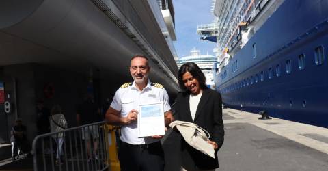 A presidente do Conselho de Administração da APRAM, Paula Cabaço, deu hoje as boas-vindas ao comandante do ‘Celebrity Ascent’, o grego Anastasios Kafetzis que hoje fez escala pela primeira vez, no Porto do Funchal.