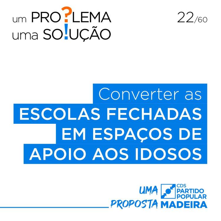 O CDS defendeu esta quarta-feira a conversão de escolas encerradas na Madeira em centros de apoio para a população idosa, criando estruturas como centros de dia, centros de noite e pequenos lares. A proposta surge como resposta ao aumento do envelhecimento demográfico e à crescente procura por serviços de apoio a idosos na Região.