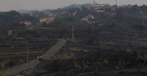 São centenas e centenas de hectares queimados. O fogo queimou tudo, incluindo residências. No lado do Caminho dos Alhos, na Santa, o cenário deixando pelo fogo é desolador.