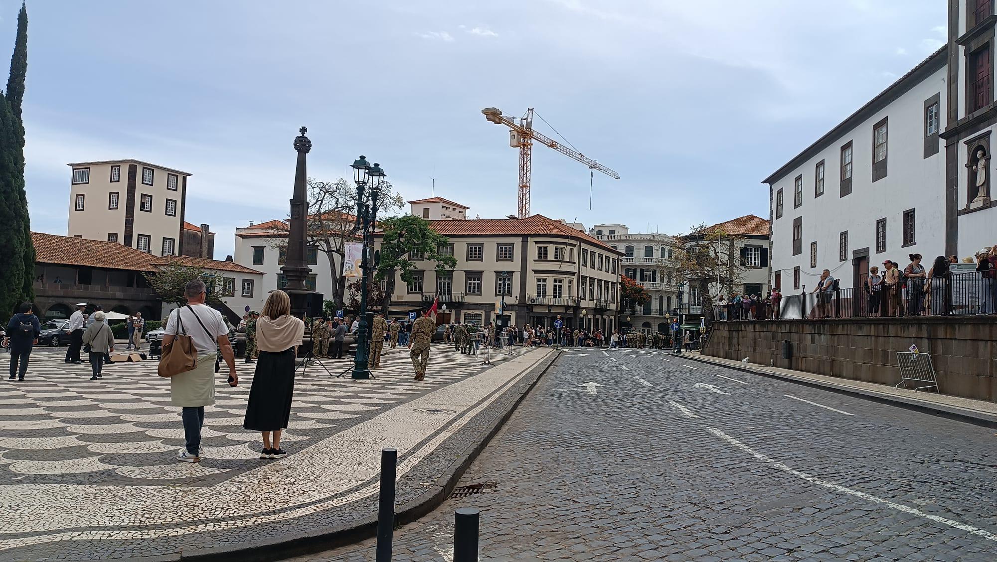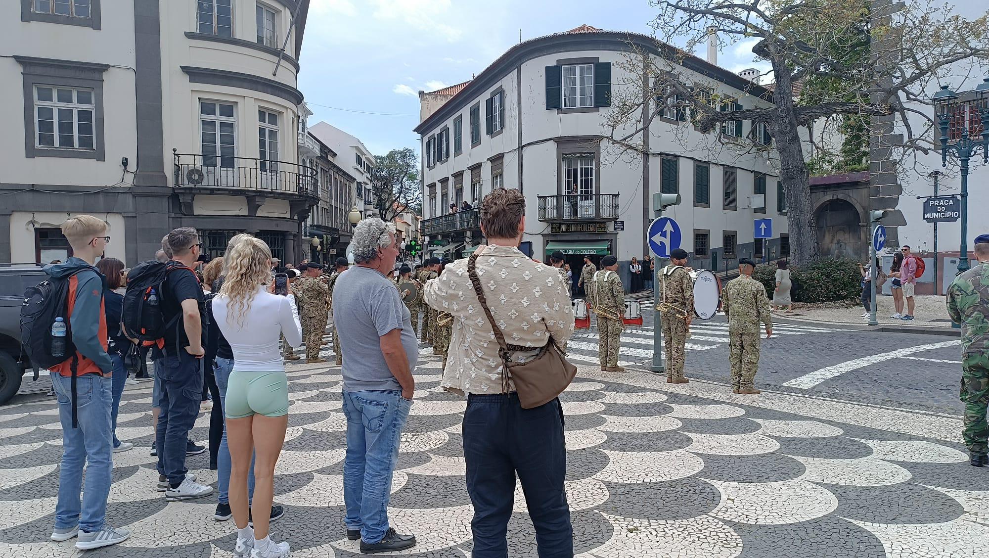 Por esta altura, decorre o ensaio para o aniversário do Comando Operacional da Madeira, atraindo a atenção dos transeuntes.