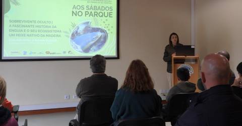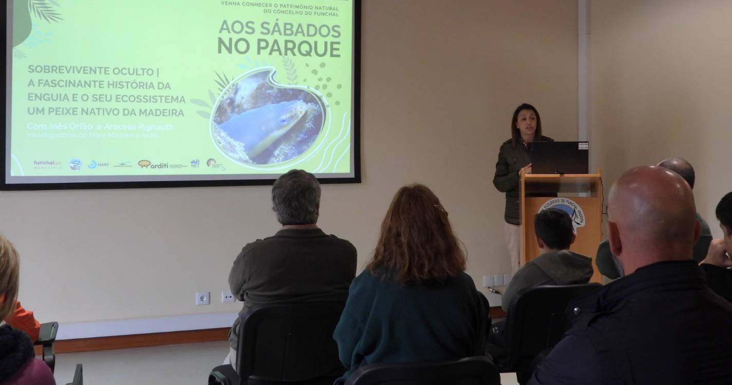 A primeira sessão, com o tema ‘Sobrevivente Oculto: A Fascinante História da Enguia e o Seu Ecossistema – Um Peixe Nativo da Madeira’, contou com a participação de Inês Órfão (MARE–ARDITI) e Aracelis Rajnauth (OOM–ARDITI), investigadoras que abordaram a biologia da enguia (Anguilla anguilla), os desafios de conservação da espécie e a importância da qualidade da água nas ribeiras da ilha.