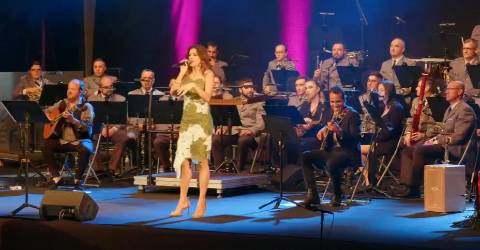A fadista Cuca Roseta, com um vestido de bordado Madeira, está a atuar no Parque de Santa Catarina, acompanhada pela Banda Militar da Madeira.