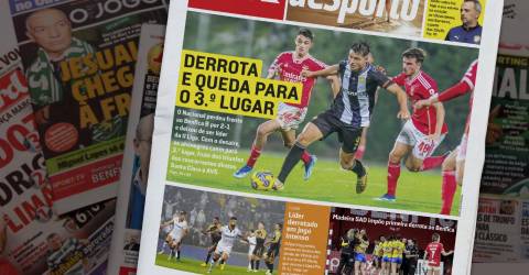 Nacional perdeu frente ao Benfica B por 2-1 e deixou de ser líder da II Liga. ‘Derrota e queda para o 3.º lugar’ é a manchete da capa do noticiário desportivo do JM de hoje.