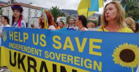 Os manifestantes recebem aplausos e incentivos. Gritam Glória à Ucrânia.