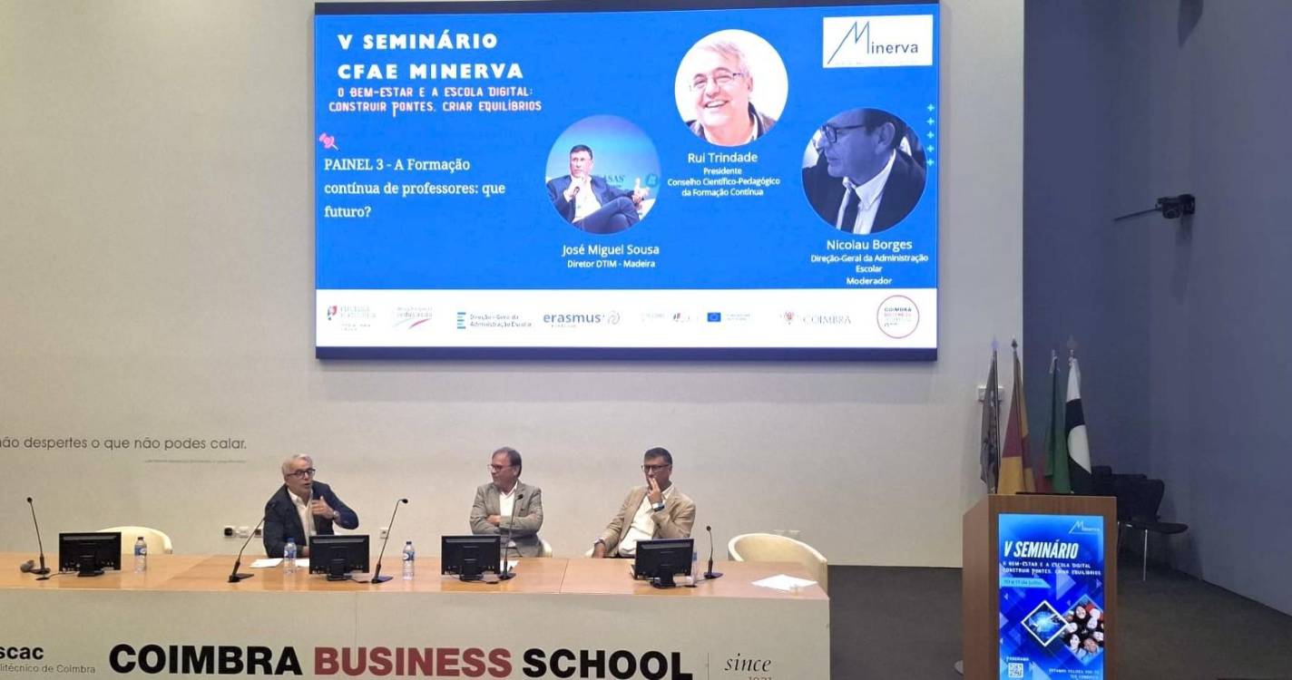 O diretor-Geral da Associação Regional para o Desenvolvimento das Tecnologias de Informação na Madeira (DTIM), José Miguel Sousa, foi um dos oradores convidados no V Seminário do Centro de Formação Minerva. Este ano, o evento foi subordinado ao tema ‘O Bem-Estar e a Escola Digital: Construir Pontes, Criar Equilíbrios’, que decorreu nos dias 10 e 11 de julho no Grande Auditório da Coimbra Business School | ISCAC.