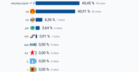 Em terceiro lugar ficou o Chega, com 6,36%, seguinbdo-se o JPP e o PTP.