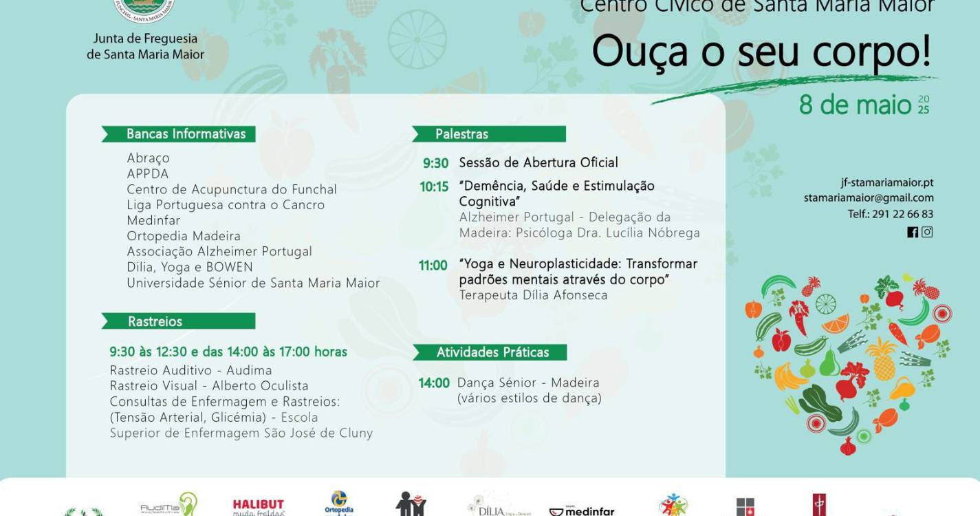 A 9.ª edição do encontro pela saúde ‘Ouça o seu corpo’, dinamizada pela Junta de Freguesia de Santa Maria Maior, acontece a 8 de maio, entre as 9:30 e as 17:00 horas com as habituais bancas informativas, palestras, atividades práticas, rastreios auditivos, rastreios visuais e medição dos níveis de glicémia e de tensão arterial, pela Escola Superior de Enfermagem São José de Cluny.