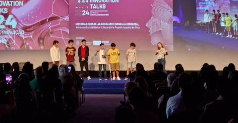 O momento de diálogo entre os oradores e a plateia foi antecedido pela presença no palco de um grupo de alunos de 7.º ano, da Escola Básica e Secundária Ângelo Augusto da Silva, que apresentou dois projetos de robótica destinados destinados a apoiar invisuais - Blind Guard e Bengala Sensorial.