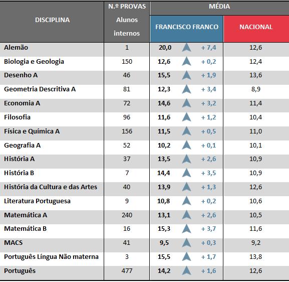De acordo com a referida fonte, as disciplinas com maior diferença pontual em relação á média nacional foram Alemão (+ 7,4 valores); Matemática B (+ 3,7 valores); História B (+ 3,5 valores); Geometria Descritiva A (+ 3,4 valores); Economia A (3,2 valores); Matemática A e História A (+ 2,6 valores).