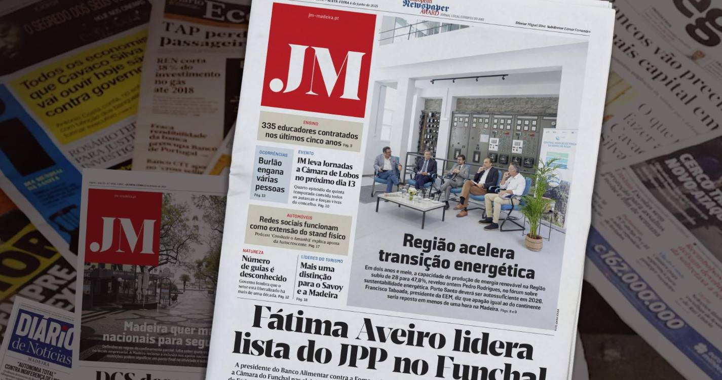 Esta é a notícia que faz a manchete de hoje do seu JM, numa Primeira Página cujo destaque fotográfico vai para um evento em Dia do Ambiente. Região acelera transição energética. Em dois anos e meio, a capacidade de produção de energia renovável na Região subiu de 28 para 47,8%, revelou ontem Pedro Rodrigues, no fórum sobre sustentabilidade energética. Porto Santo deverá ser autossuficiente em 2026. Presidente da EEM diz que apagão igual ao do continente seria reposto em menos de uma hora na Madeira.