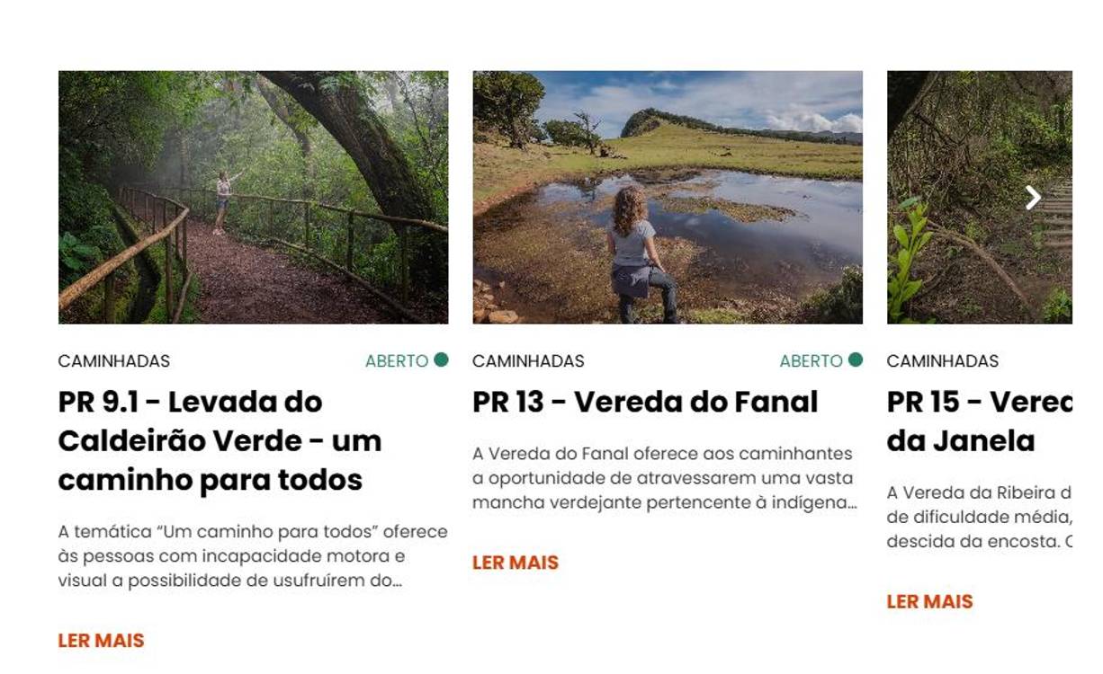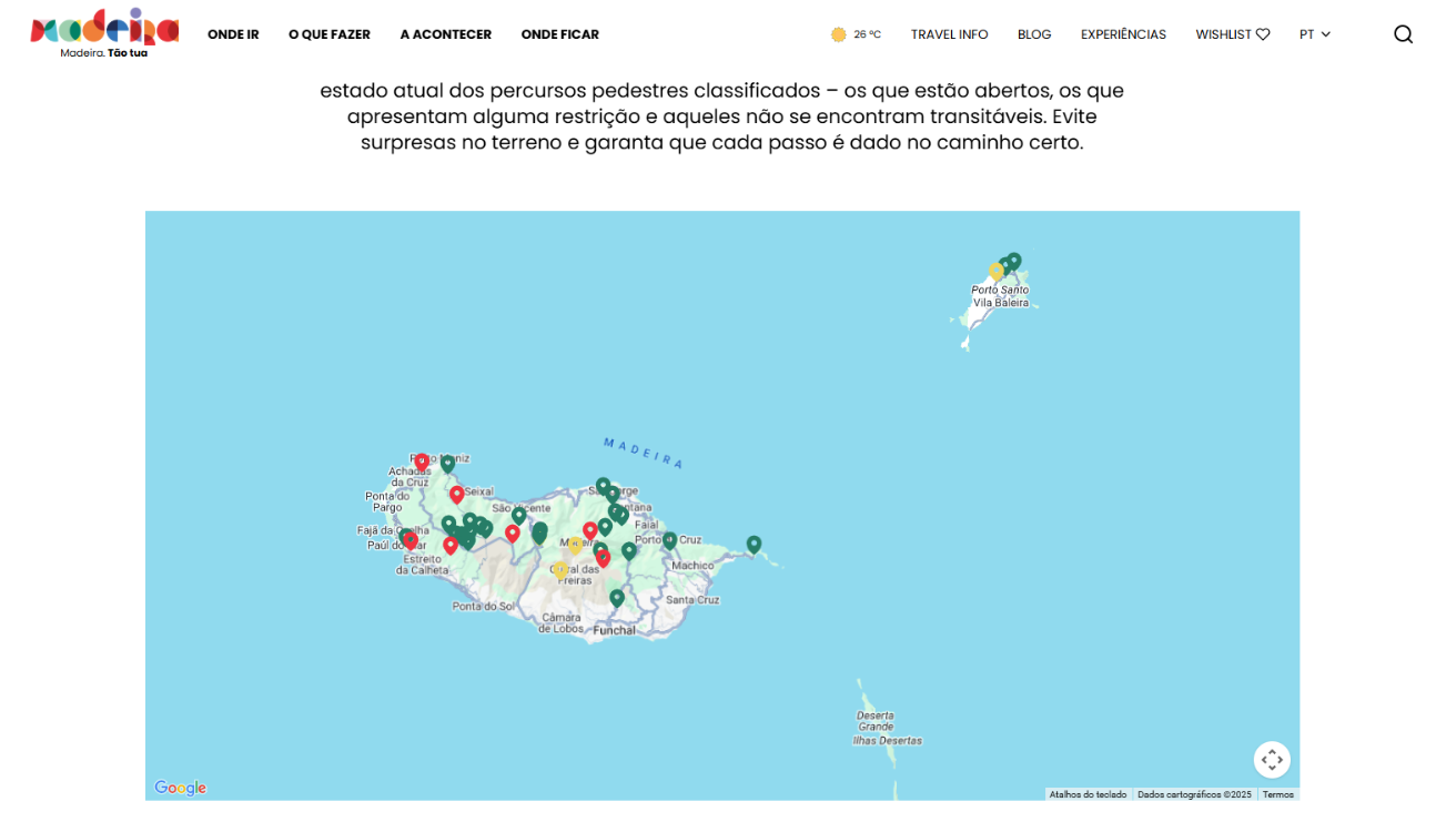 A nova funcionalidade está integrada em vários pontos estratégicos do site – desde a página inicial e carrosséis informativos, até às páginas específicas de cada percurso, resultados de pesquisa e mapa interativo da secção de caminhadas –, permitindo visualizar, através de grafismos, os percursos que se encontram abertos, condicionados ou fechados, o que garante maior visibilidade e facilita a navegação.