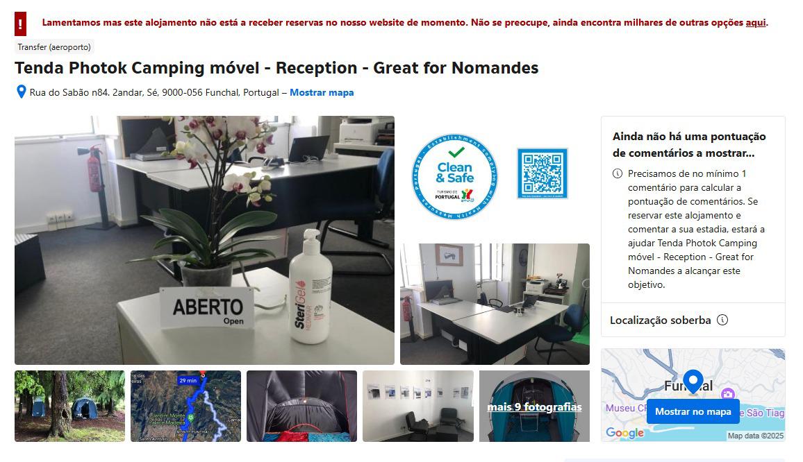 “Apresentando um jardim e acesso Wi-Fi gratuito, a ‘Tenda Photok Camping móvel - Reception - Great for Nomandes’ situa-se no centro de Funchal, perto de Praia do Almirante Reis, Marina do Funchal e Avenida do Mar. Para maior comodidade, o alojamento pode fornecer toalhas e roupa de cama por um custo extra”, lê-se no anúncio, cujas reservas já foram encerradas pelo site.