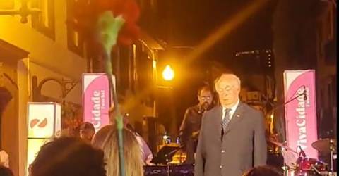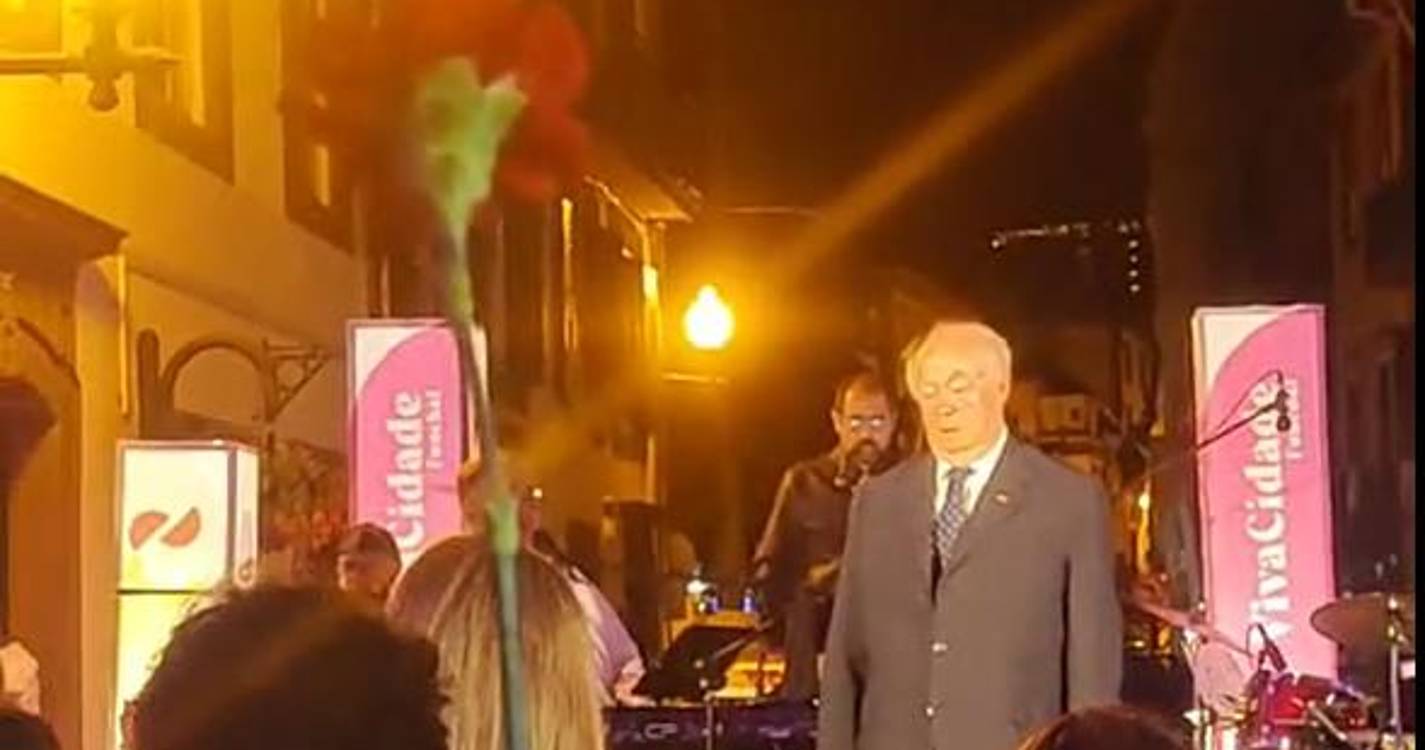 Alberto João Jardim subiu hoje ao palco, no Funchal, para cantar ‘Grândola Vila Morena’, tema de Zeca Afonso escolhido como segunda senha para a revolução do 25 de Abril de 1974.
