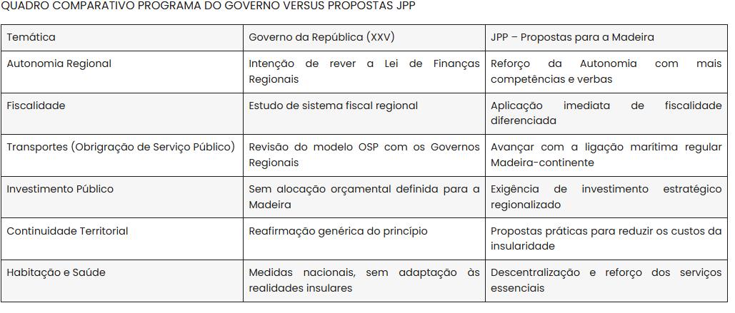 Em síntese, acrescenta: “O Programa do XXV Governo Constitucional falha na sua missão de responder aos desafios da insularidade e promover uma verdadeira coesão nacional. O documento mantém uma visão centralista, descorando as dimensões logísticas, sociais e económicas das insularidades, a Madeira permanece à margem de decisões estratégicas, com poucas garantias de execução prática. Por contraponto, o JPP apresenta uma agenda regionalista sólida, com propostas que reforçam a Autonomia, promovem justiça fiscal, combatem a exclusão logística e valorizam os recursos da Região, e é por isso que irei me debater no Parlamento”.