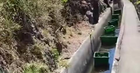 Caixas enchidas pela metade com uvas são colocadas na Levada do Norte, encarregando-se a água em movimento de as transportar ao longo de grandes distâncias sem qualquer esforço.