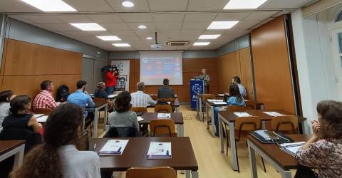 O segundo dia começou com a intervenção de Monica Quesada, do CLUSTER MARÍTIMO DAS CANÁRIAS, que participou remotamente, para falar sobre a uniformização empresarial e a promoção de certificações. Depois, Teresa Gubern, membro da ULPGC-TIDES, apresentou o questionário de autoavaliação de maturidade circular e digital para empresas de turismo náutico, um serviço criado pelo projeto.