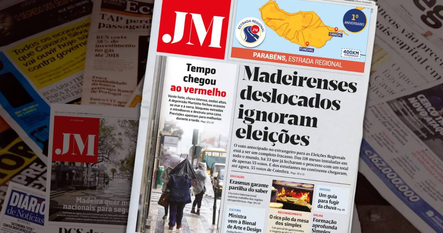 Esta é a notícia que faz a manchete de hoje do seu JM, numa Primeira Página que destaca o clima. Tempo chegou ao vermelho. Vento forte, chuva intensa, ondas altas. A depressão Martinho fechou acessos ao mar e à serra, bloqueou estradas e miradouros e destruiu uma casa. Previsões apontam para melhorias durante a tarde.