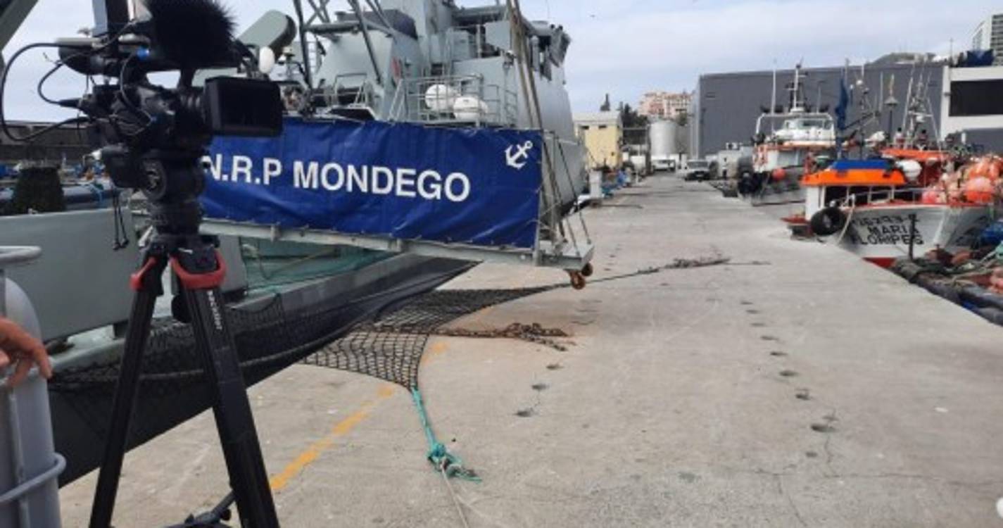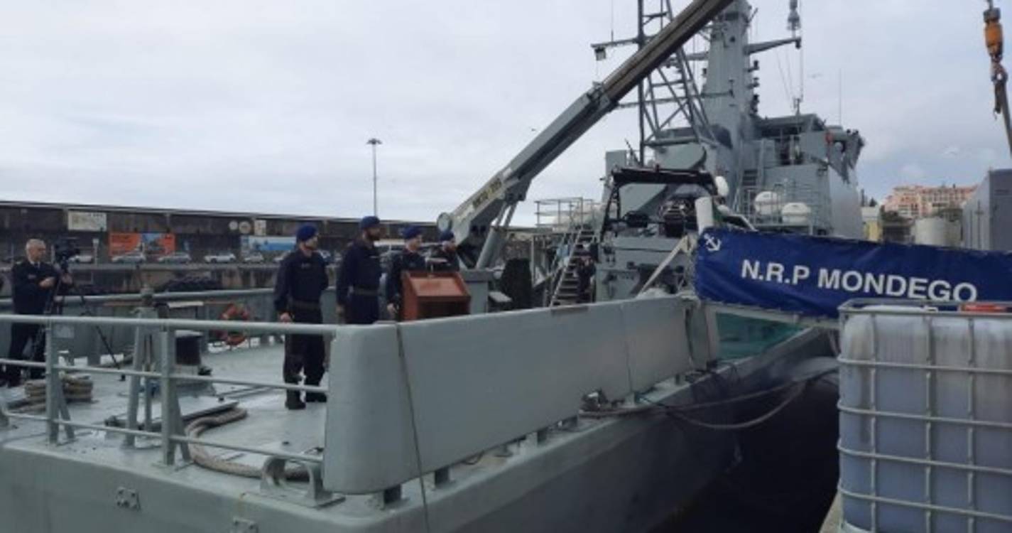 No NRP Mondego, está montado um palanque com microfone, virado para o interior do navio, enquanto a comunicação social aguarda em terra.