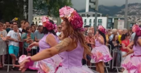 Com muita energia ao longo do percurso, segue a trupe FT fitness, com varias crianças e adultos a dançarem de forma animada, em homenagem à flor.