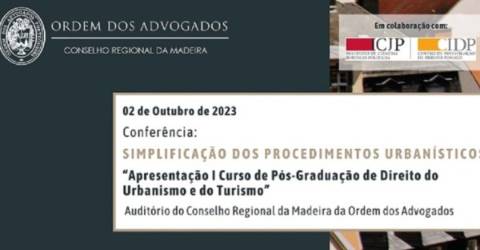 O Conselho Regional da Madeira da Ordem dos Advogados promove uma conferência dedicada à Simplificação dos Procedimentos Urbanísticos, "Apresentação I Curso de Pós- Graduação de Direito do Urbanismo e do Turismo", que terá lugar, no dia 2 de outubro de 2023, das 14h30 às 18h15