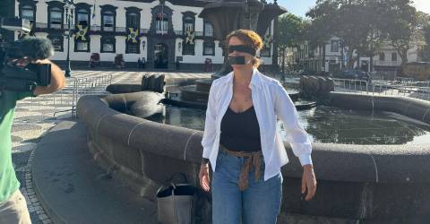Marta Sofia apareceu na Praça do Município com uma venda nos olhos e uma fita preta na boca, exibindo um cartaz onde se podia ler “SOS”, numa alusão ao momento difícil que a ilha está a atravessar devido à progressão do incêndio.