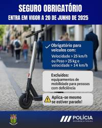 A Polícia de Segurança Pública (PSP) lançou este sábado uma informação sobre o seguro obrigatório para trotinetes e outros veículos de mobilidade pessoal, que entra em vigor a 20 de junho, na próxima sexta-feira.