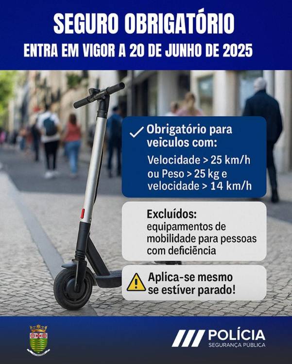 Segundo uma nota da PSP, través do Comando Regional, todos os utilizadores de trotinetes elétricas e outros dispositivos motorizados de mobilidade pessoal (DEMOP) passam a estar obrigados a contratar um seguro de responsabilidade civil, conforme estipulado pelo Decreto-Lei n.º 26/2025, de 20 de março.