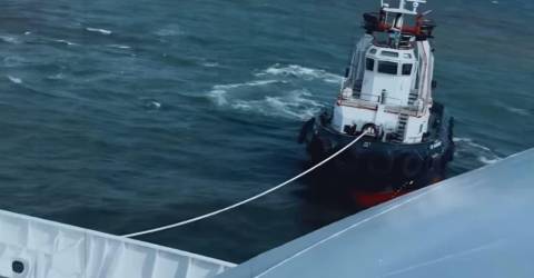 O rebocador da APRAM já se encontra a auxiliar o Lobo Marinho na manobra para atracar no porto do Funchal, depois das dificuldades causadas pelo vento e pela forte ondulação, que esta tarde impediram o navio de acostar no seu lugar habitual.