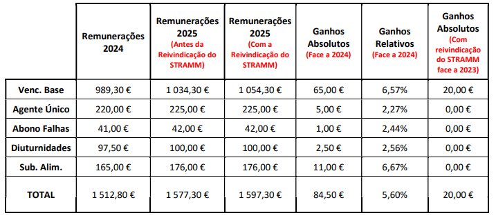 Deste modo, face a 2024, os Associados do STRAMM terão um aumento de 84,50€. Ou seja, um trabalhador que acabou de entrar na empresa passará a receber 1 497,30€ e um trabalhador que tenha as 5 diuturnidades passará a receber 1 597,30€!