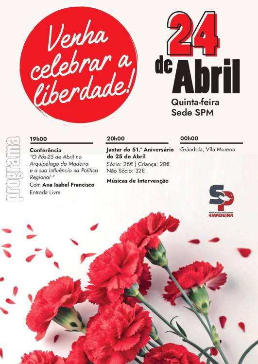 O Sindicato dos Professores da Madeira assinala hoje o 51.º aniversário da Revolução dos Cravos, na sua sede, à calçada da Cabouqueira, pelas 19h00.