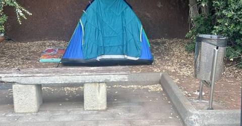 A imagem, que chegou até nós através de um leitor atento, não deixa margem para dúvidas. O local não foi escolhido ao acaso, pois a tenda está montada à sombra, num espaço de jardim, próximo ao banco de cimento e a um caixote do lixo.