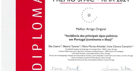 O trabalho intitulado “Incidência dos principais tipos polínicos em Portugal (Continente e Ilhas)” da autoria de Elsa Caeiro, Beatriz Tavares, Mário Morais-Almeida e Irene Camacho (docente da Faculdade de Ciências da Vida da Universidade da Madeira, UMa) recebeu o 1º Prémio SPAIC -RPIA para o melhor artigo científico original publicado em 2024 na Revista Portuguesa de Imunoalergologia (RPIA). “Trata-se de mais um reconhecimento na carreira desta docente da UMa e atual membro do painel editorial da ‘Aerobiologia Journal’, a melhor revista científica internacional da atualidade no domínio da aerobiologia”, refere a UMa em nota de imprensa.