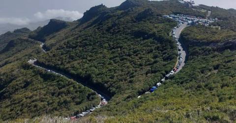 A Achada do Teixeira, em Santana, apresenta hoje um cenário pouco habitual para esta hora, tendo em conta que as filas de viaturas estacionadas ao longo da estrada se estendem por vários quilómetros, como é visível numa das imagens recolhidas no local. Ao JM, uma profissional do setor do turismo revelou que é praticamente impossível circular até à zona de estacionamento da Achada do Teixeira, onde existe um parque destinado a esse fim.