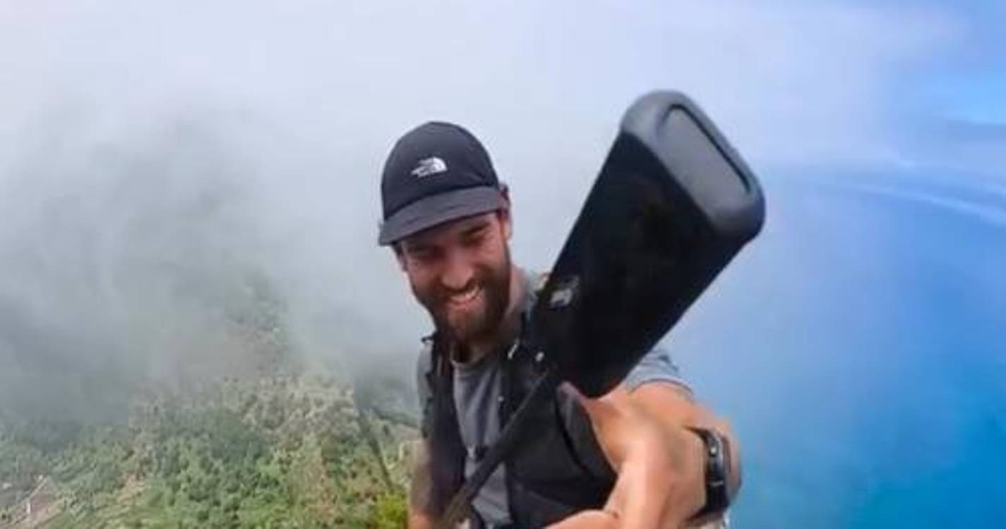 Verdade são as belas imagens e o perigo que este homem passa, ao percorrer parte de um penhasco de uma montanha em São Vicente. Pela indumentária, parece ser um turista apaixonado pelo trail e pelas montanhas.