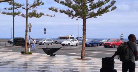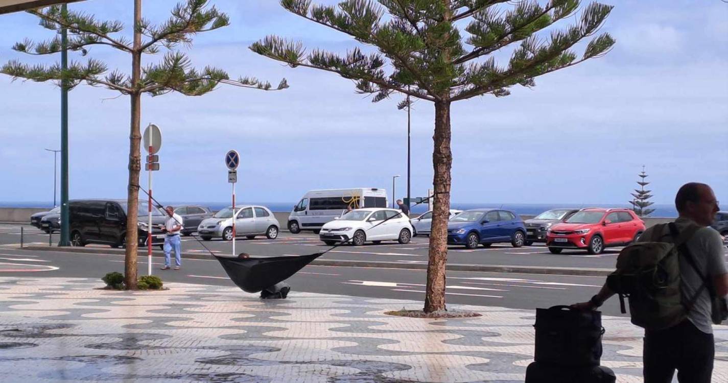 Nesta altura, na zona das chegadas, outro turista está a suscitar atenções pelo facto de ter montado uma cama de rede sustentadas em duas das árvores lá existentes.