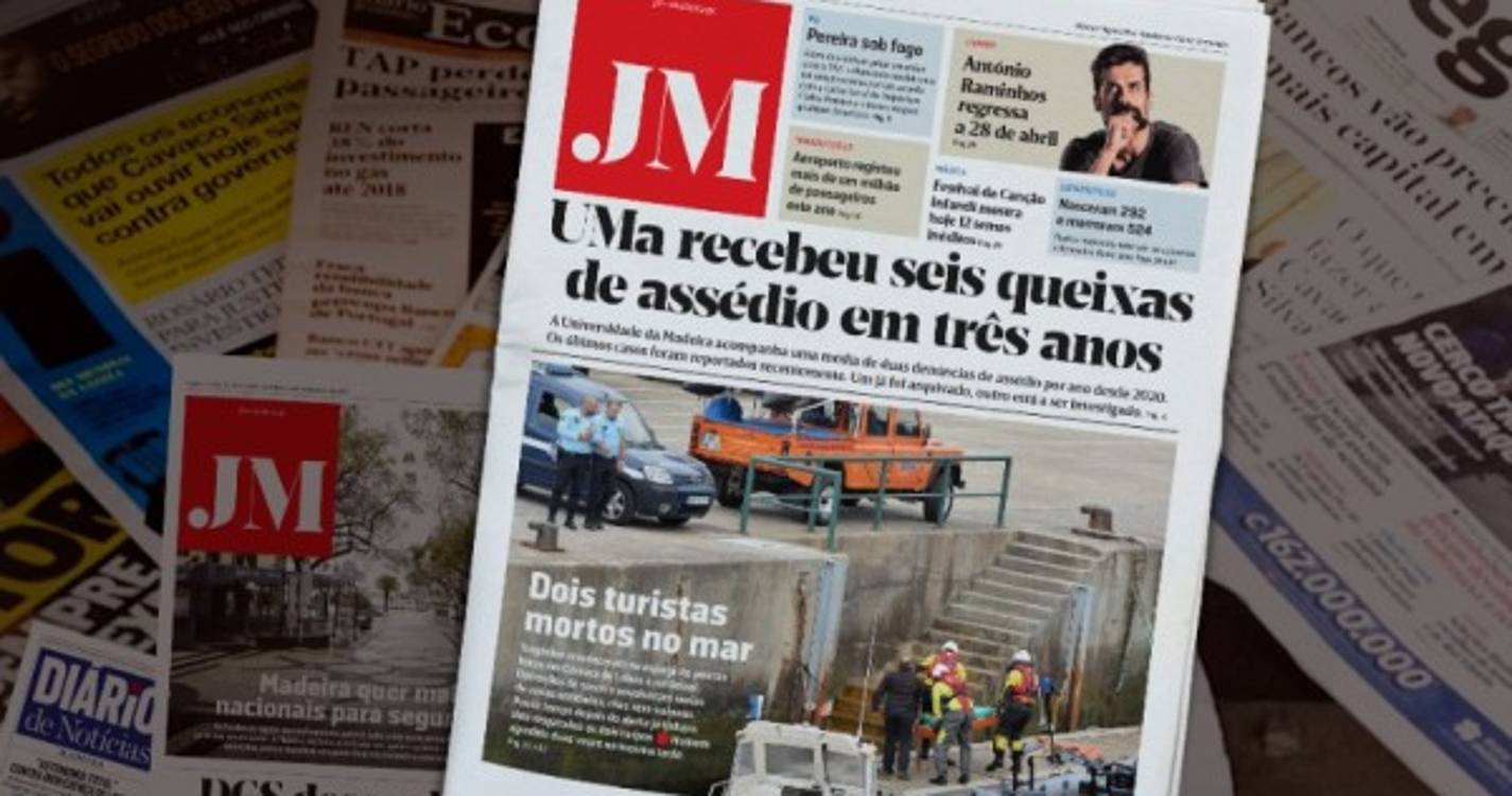 Esta é a notícia que faz a manchete de hoje do seu JM, numa Primeira Página que destaca uma tragédia. Dois turistas mortos no mar. Tragédias aconteceram no espaço de poucas horas em Câmara de Lobos e no Seixal. Operações de socorro envolveram meios de várias entidades, mas sem sucesso. Pouco tempo depois do alerta já tinham sido resgatados os dois corpos. Homem agredido duas vezes na mesma tarde.