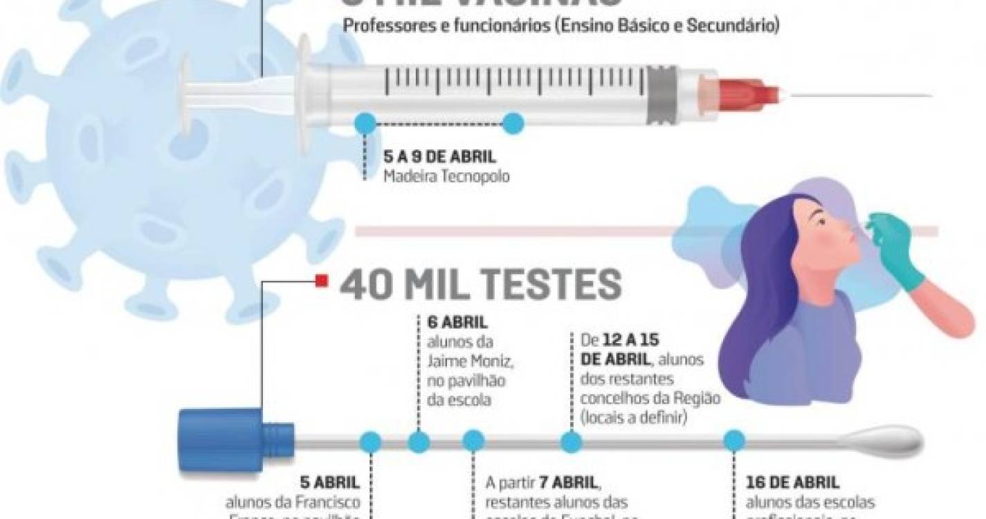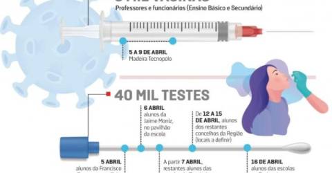 Jorge Carvalho confirmou ao Jornal que os docentes afetos à Região que exerçam as suas atividades no ensino básico e no ensino secundário vão ser vacinados entre os dias 5 e 9 de abril. A operação de testagem aos cerca de 40 mil alunos seguirá um plano que começa também na segunda-feira de Páscoa, estendendo-se até 16 de abril.