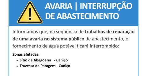A Junta de Freguesia do Caniço informa que na sequência de trabalhos de reparação de uma avaria no sistema público de abastecimento, o fornecimento de água potável estará interrompido amanhã, terça-feira, entre as 08h30 e as 14h00, no Sítio da Abegoaria e na Travessa da Paragem.
