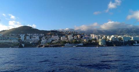 À passagem pela Fajã dos Padres, a embarcação parou para mergulhos e aí permaneceu enquanto o sol foi descendo no horizonte.