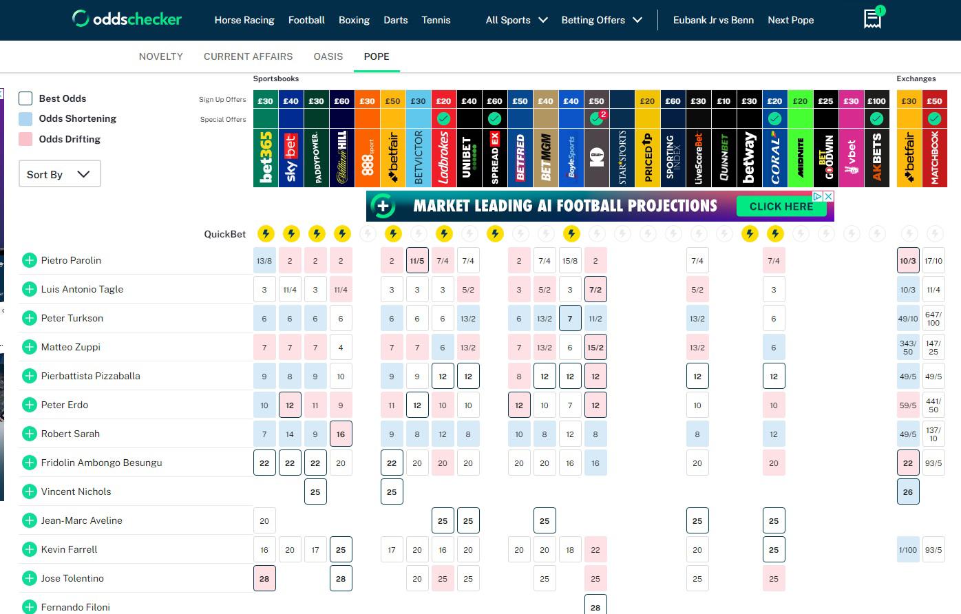 Nas casas de apostas inglesas, o berço das apostas desportivas, a luta também é entre Parolin e Tagle.