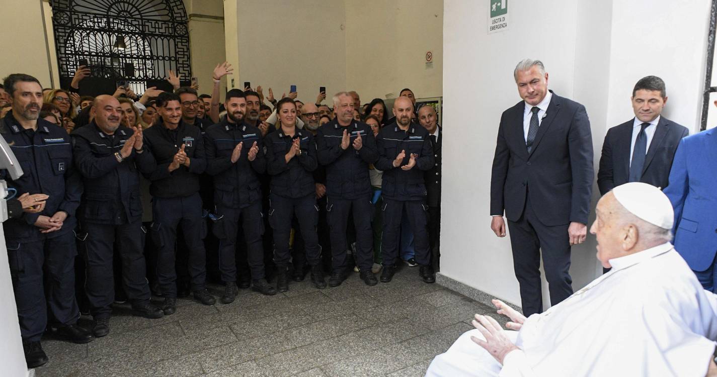 Jorge Bergoglio efetuou a visita em cadeira de rodas, que já usava antes de ser hospitalizado devido aos problemas de mobilidade, e foi recebido pelos diretores e funcionários da cadeia sob aplausos.